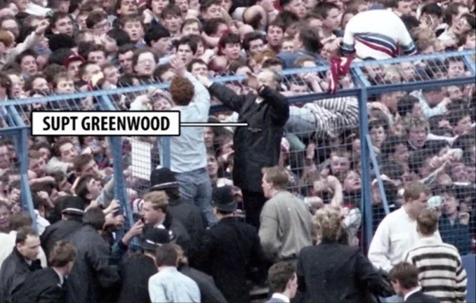 No, he is not the conductor of a symphony. He is motioning to the crowd. At the same time, we see another police officer at the gate leading from the pen to the pitch. No more than two people can fit through the perimeter fence at a time. Is he pulling people out or is he pushing people back in? And what about Greenwood? Is he motioning for people to move back? If there is a lethal crush occurring in that pen, it is because that pen is packed full of people. And if people are being crushed to death only inches in front of him, he would clearly see the crowd. Simply put, there is no way to save anyone by motioning the vast crowd to start trying to back up. But Greenwood is not the only one doing this: