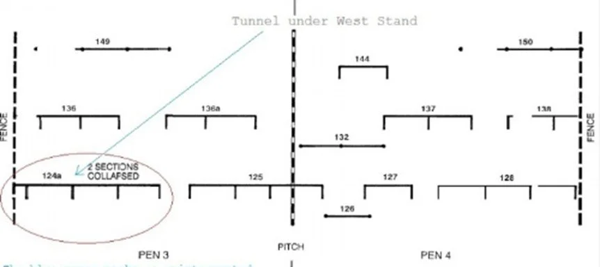 This is a diagram that forms part of a particularly fascinating and certainly expert discussion of the architecture of the pens by someone far more knowledgeable than me. Still, I will make comments on details that only a person with many questions and apparently no answers would blunder into. Crush barriers are designed to keep fan pressure from becoming highly concentrated against people in each forward section. The people at the very front are at the most risk, then those in the next zone, and so on, moving back to the Tunnel. Two key changes had taken place in the years prior to the disaster in 1989. First, the barrier in Pen 4 labeled “144” seems to have dubious value. And it did, but not always. There were two more segments at one time, another segment in Pen 4 that ran to the fence separating the two pens, and one segment in Pen 3 that ran to the same wall. The purpose? The barriers would have had the effect of keeping a sudden, rapid influx into the pen from bearing straight down on those already in the pen by requiring a turn. So the people behind an intact barrier 136 would be protected. Strangely enough, the two segments were removed to allow a more rapid flow into the pens…which is just what the barriers were supposed to prevent. Then the police had the middle section of barrier 136 removed, creating barriers 136 and 136a. The long Crush Barrier 136 protected the people between it and 124a/125. The police wanted the segment removed so they could gain easier access to trouble-makers who might be creating a disturbance in the pen. As the diagram shows, its removal allowed a mean for a large influx of fans to exert potentially enormous pressure on people who had once been protected. It’s been argued that on the day of the disaster, this is exactly what happened. And it is a fact that barrier 124a collapsed: